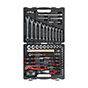 Un set di chiavi combinate, una borsa porta attrezzi, uno zaino porta attrezzi e una chiave a bocca regolabile